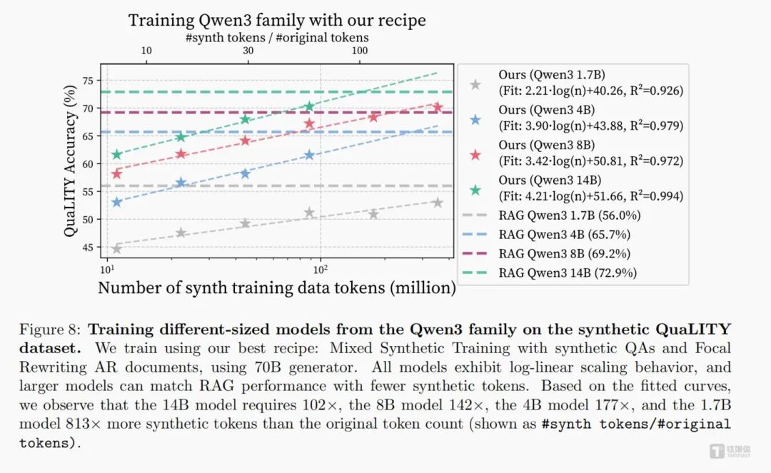 该技术对中小参数模型格外友好,8B及以下的轻量模型,仅需少量高质量合成数据,就能达到甚至超越传统RAG的效果,无需堆砌海量算力,不用搭建复杂的检索系统,大幅降低了企业落地门槛,让中小厂商也能轻松布局垂直领域AI。
