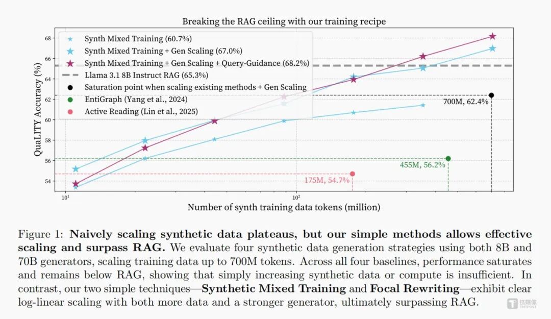 这支顶尖团队最初也遭遇了同样的瓶颈。在多轮测试中,单纯使用合成问答对、或是仅用合成文档训练模型,性能提升都极为缓慢,即便加大数据投放量,效果也会快速触顶,甚至比成熟RAG方案低4.6%。