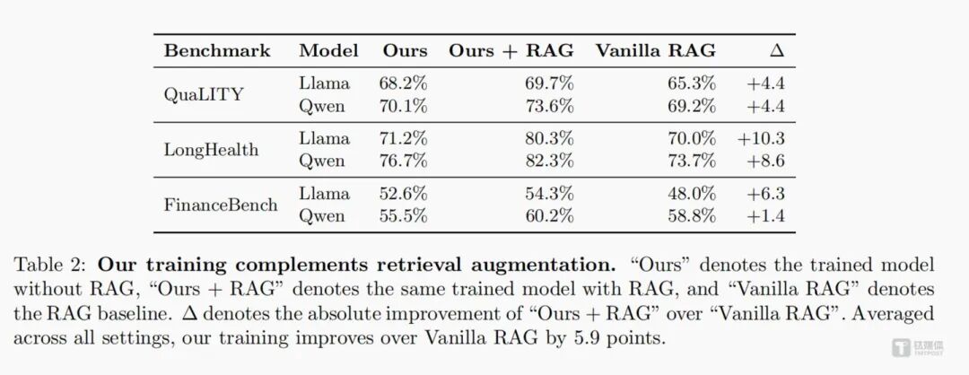 这套组合策略,交出了亮眼的成绩单。论文实验数据显示,在长文本理解(QuALITY)、医疗专业问答(LongHealth)、金融分析研判(FinanceBench)三大权威测试场景中,通过SMT与Focal Rewriting组合策略微调的模型,实现了对传统RAG的超越,在QuaLITY数据集上领先幅度高达4.4%。更具实用价值的是,将SMT训练后的模型与RAG结合使用,性能可在原有基础上再提升9.1%,实现双重增效。