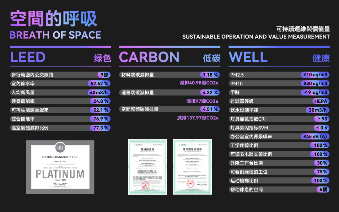 通过与“材料乘以设计”团队及“碳阻迹”团队的协作,上海总部项目展示了如何建立可持续材料库。系统能够实时核算整个项目的碳足迹,并提出优化建议。