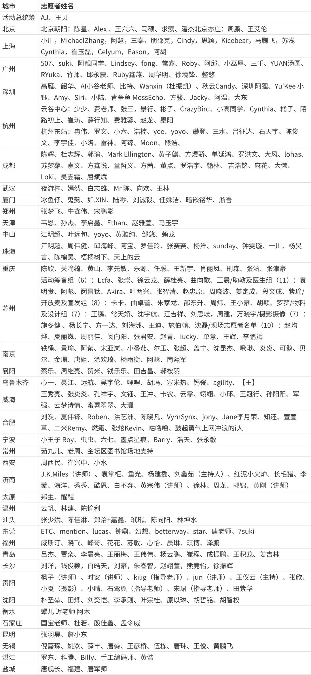 以下为部分城市志愿者名单: