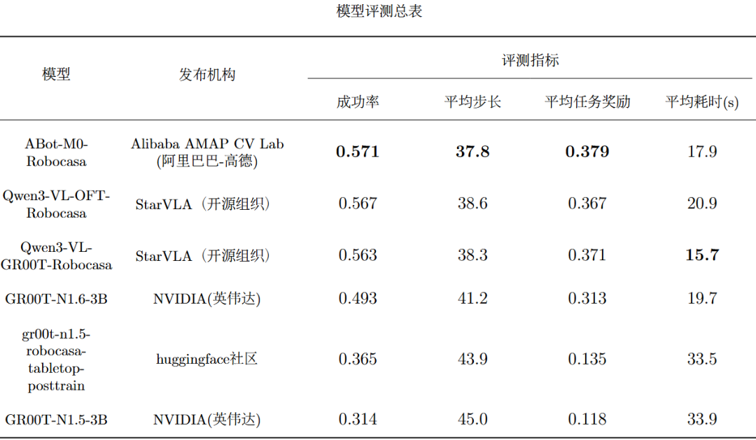 EmbodiedCLUE-VLA具身智能大脑测评基准选取截至目前在RoboCasa GR1 Tabletop上统一训练过且有开源权重的6个模型参与本次评测。目前已完成统一接入的6个模型如下表所示:这六个模型涵盖了starVLA、ABot和GR00T等多条技术路线。二、评测配置及评测指标