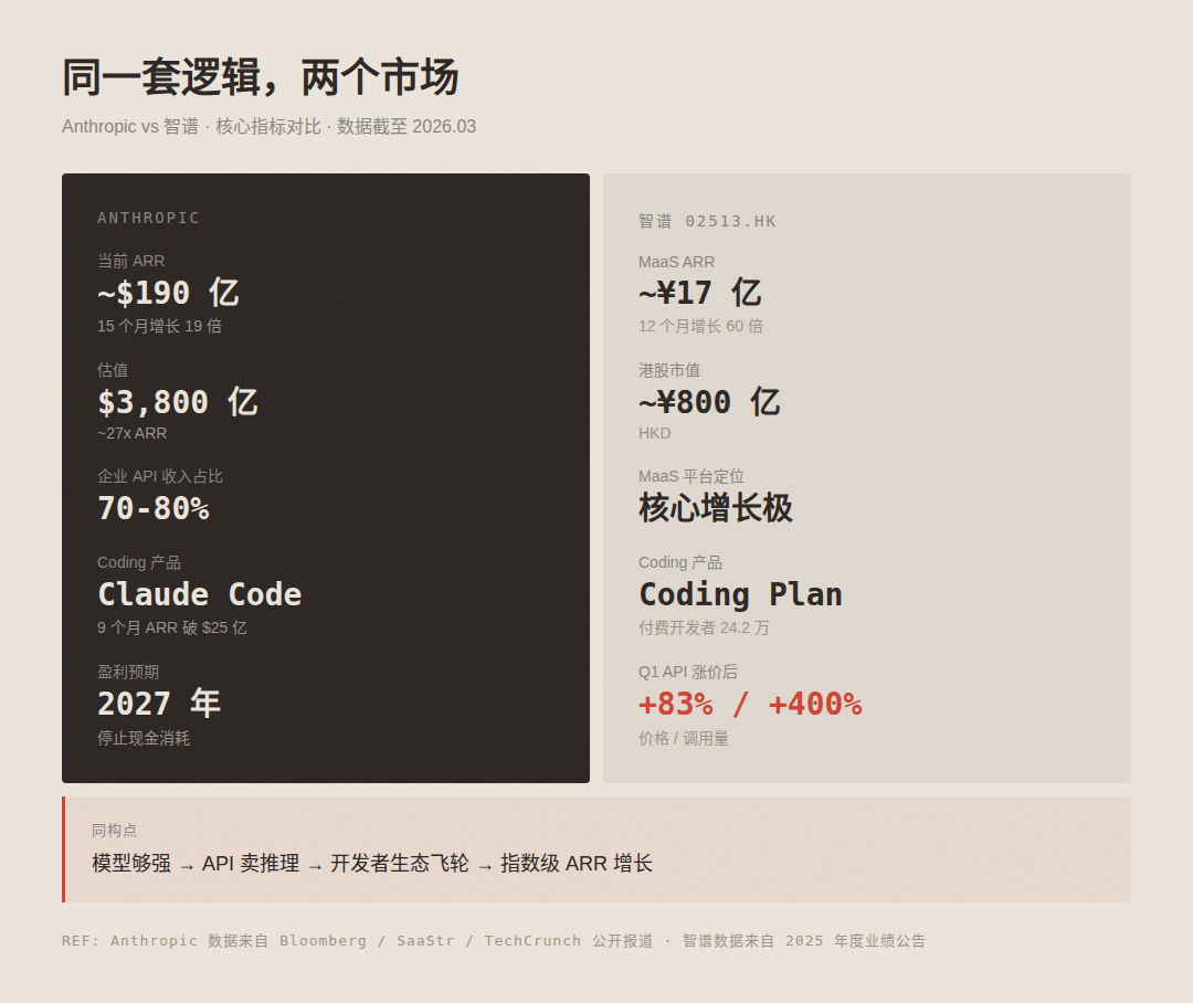 张鹏在业绩发布会上把智谱的商业路径定义为「中国的 Anthropic」。Anthropic 的 ARR 从 2024 年底约 10 亿美金,到 2025 年底约 90 亿美金,到 2026 年 3 月已经接近 190 亿美金。Claude Code 单产品 ARR 超过 25 亿美金。约 70-80% 的收入来自企业级 API 调用