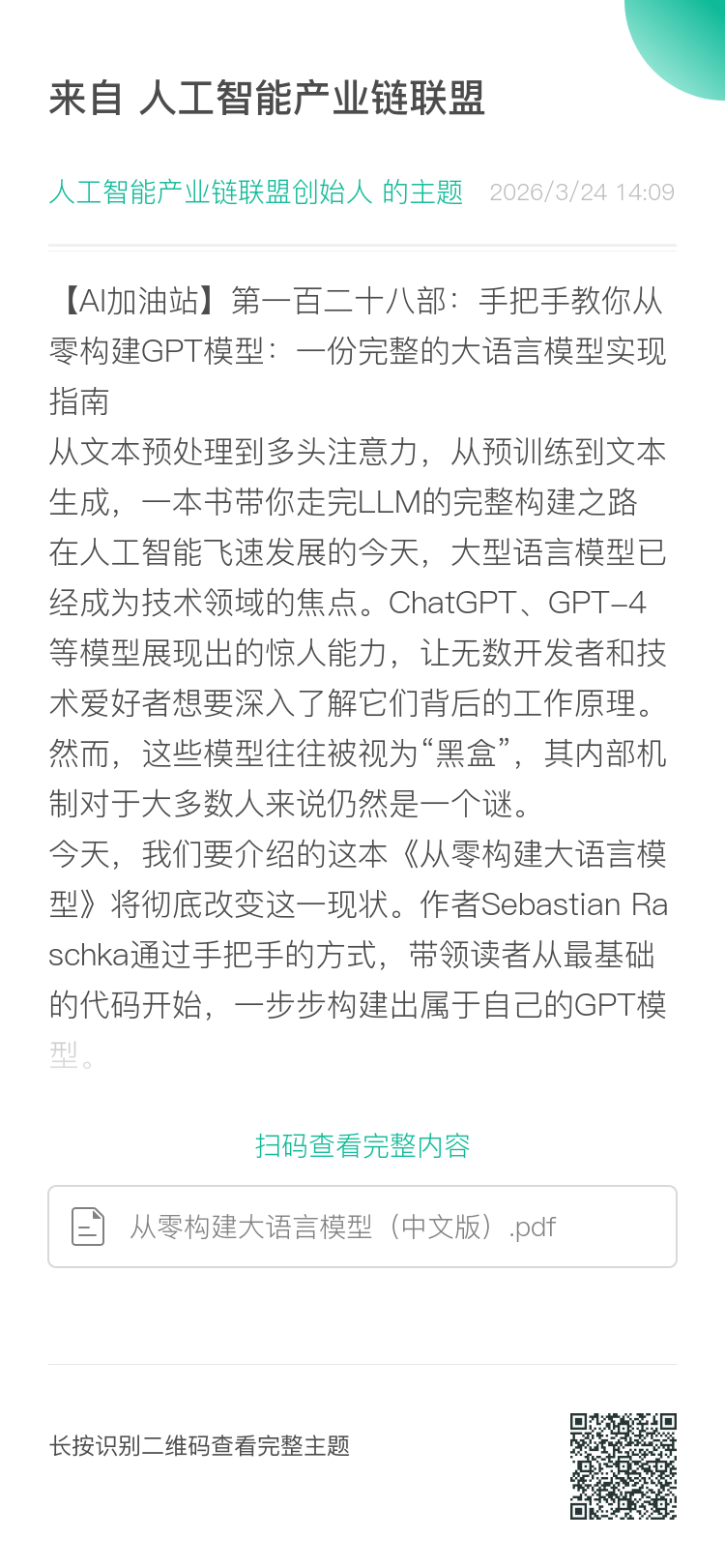 【AI加油站】第九部:《Python深度学习(中文版)》(附下载)【AI加油站】第十二部:《从零开始的机器学习》(附下载)【AI加油站】第十三部:《Transformer入门到精通》(附下载)【AI加油站】第十四部:《LLM 应用开发实践笔记》(附下载)【AI加油站】第十五部:《大模型基础 完整版》(附下载)【AI加油站】第十六部:《从头训练大模型最佳实践》(附下载)【AI加油站】第十八部:《深度强化学习》(附下载)【AI加油站】第十九部:清华大学《大模型技术》(附下载)【AI加油站】第二十部:Prompt入门神书-《Prompt 学习指南》(附下载)【AI加油站】第二十一部:吴恩达&open AI联合推出《大模型通关指南》(附下载)【AI加油站】第二十二部:《李宏毅深度学习教程》值得反复阅读的神书!(附下载)【AI加油站】第二十三部:Prompt经典中文教程-《提示工程指南》(附下载)【AI加油站】第二十四部:爆火下载28万次!MIT最新神书《理解深度学习》(附下载)【AI加油站】第二十五部:LLM4大名著,OpenAI专家强推《深度解析:大语言模型理论与实践》(附下载)【AI加油站】第二十六部:NLP大牛Thomas Wolf等新书《Transformer自然语言处理》(附下载)【AI加油站】第二十七部:哈工大博士耗时一年整理《PyTorch常用函数手册》,轻松掌握PyTorch的各种操作(附PDF下载)【AI加油站】第二十八部:大模型炼丹大师必备《深度学习调优指南中文版-系统性优化模型》(附下载)【AI加油站】第二十九部:炸裂发布!《大语言模型:导论》重磅发布!(附下载)【AI加油站】第三十部:最值得读的LLM书!下载量10w+!《基于Transformer和扩散模型的生成式AI》(附下载)【AI加油站】第三十一部:RL稀缺宝典!《强化学习的艺术》(附下载)【AI加油站】第三十二部:一本醍醐灌顶的教科书!《大语言模型提示工程:构建LLM应用的艺术与科学》(附下载)【AI加油站】第三十三部:机器学习好评榜第一《机器学习基础》(附下载)【AI加油站】第三十四部:所有大模型领域学习者必读,没有之一!由深度学习三巨头联合撰写!(附下载)【AI加油站】第三十五部:{AI炼丹神书}——从0到1榨干深度学习模型每一滴性能的终极战术手册《深度学习调优指南》(附下载)【AI加油站】第三十六部:面向生产环境的大型语言模型实战手册《LLM 大语言模型构建指南》(附下载)【AI加油站】第三十七部:《深度学习的数学导论:方法、实现与理论》从神经网络架构到物理信息模型的全景综述(附下载)【AI加油站】第三十八部:下载量10w+!《大型语言模型:语言理解和生成》从文本分类到主题建模的实战指南(附下载)【AI加油站】第三十九部:包教包会!《从零开始构建大语言模型的关键要点》大模型训练全景指南:从0到1的系统性最佳实践(附下载)【AI加油站】第四十部:《大规模机器学习训练工程实战手册》——从硬件选型到故障恢复的系统性指南(附下载)【AI加油站】第四十一部:《ChatGPT后训练全景解析:技术演进、核心挑战与未来方向》(附下载)【AI加油站】第四十二部:《百页机器学习书》:从算法到实战的全景指南(附下载)【AI加油站】第四十三部:《掌握大语言模型》核心知识速览:从NLP基础到LLM前沿实践(附下载)【AI加油站】第四十四部:《精通PyTorch》-从CNN到Transformer、LLM、GNN的端到端实战图谱(附下载)【AI加油站】第四十五部:《图神经网络导论》-全景拆解:从数学基石到落地应用的知识地图(附下载)【AI加油站】第四十六部:谷歌大佬编写,我唯一熬夜看完的机器学习神作《机器学习:概率视角》(附下载)【AI加油站】第四十七部:复旦大学张奇老师《自然语言处理导论》(附下载)【AI加油站】第四十八部:Github持续霸榜!「Leetcode刷题笔记」解题思路/代码/模板开放下载!(附下载)【AI加油站】第四十九部:下载10W+爆火神书《基于LangChain进行生成式AI开发》(附下载)【AI加油站】第五十部:打破 “AI 神话”!《AI 3.0 》剖析机器智能的真实能力,探讨人机共生的未来图景(附下载)【AI加油站】第五十一部:从 PGC 到 AIGC:内容生产的颠覆性革命,一文看透智能创作如何重塑经济与社会(附下载)【AI加油站】第五十二部:《人工智能简史》穿越 AI 百年:从 “机器替代” 到 “人机共生” 的技术革命与人性思考(附下载)【AI加油站】第五十三部:智能无疆:《人工智能:现代方法(第 4 版)》全景解读(附下载)【AI加油站】第五十四部:《深度学习革命》从学术寒冬到全球科技争霸的十年史诗(附下载)【AI加油站】第五十五部:《生命 3.0》人工智能时代的进化史诗与未来抉择(附下载)【AI加油站】第五十六部:《我看见的世界-李飞飞自传》从移民少女到 AI 先驱:李飞飞与 ImageNet 的破晓之路(附下载)【AI加油站】第五十七部:《智人之上》解码从石器时代到 AI 时代的信息网络密码(附下载)【AI加油站】第五十八部:《千脑智能》解锁智能本质:从千脑智能理论到人类与 AI 的未来图景(附下载)【AI加油站】第五十九部:《AI极简经济学》解锁 AI 商业价值:从预测核心到战略重构的极简经济学指南(附下载)【AI加油站】第六十部:深入探索《人工智能哲学》:从理论根基到核心争议与未来展望(附下载)【AI加油站】第六十一部:解构 《人类 2.0》:硅谷视角下科技重塑未来的全景蓝图(附下载)【AI加油站】第六十二部:以逻辑、艺术与音乐为钥,解锁思维本质的奇书 ——《哥德尔、艾舍尔、巴赫》(附下载)【AI加油站】第六十三
