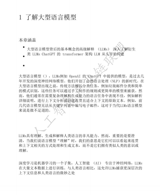 书中首先为读者构建了理解LLM的宏观框架。大型语言模型本质上是一种神经网络,旨在理解、生成和响应类似人类的文本。这些模型在大量文本数据上进行训练,有时包含互联网上整个公开文本的大部分内容。