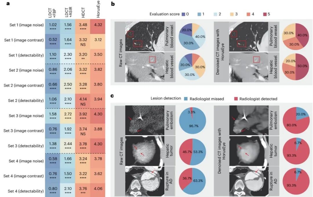 图 5:HorusEye 临床评估。a,低剂量 CT 经不同方法处理后的噪声、对比度和病变可检测性评分对比;b,HorusEye 增强血管可视化效果;c,HorusEye 帮助检出最初被遗漏的病变案例