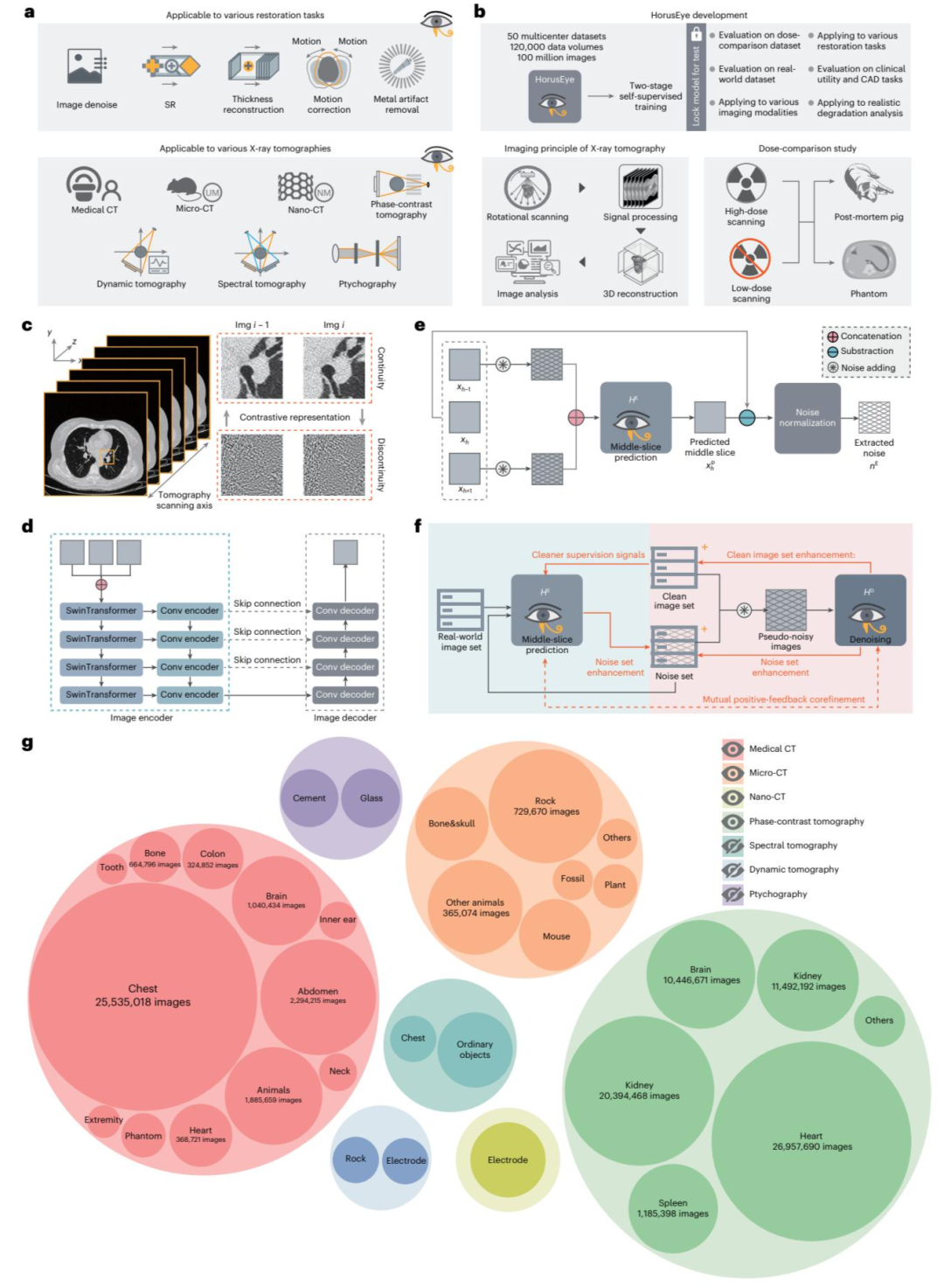 图 1:HorusEye 整体架构、开发流程与数据集概览。a-b,模型适用于多种修复任务和成像模态;c,结构信息的片间连续性与噪声的片间不连续性;d,基于 SwinUNet 的模型架构;e-f,自监督训练策略;g,大规模多模态数据集组成