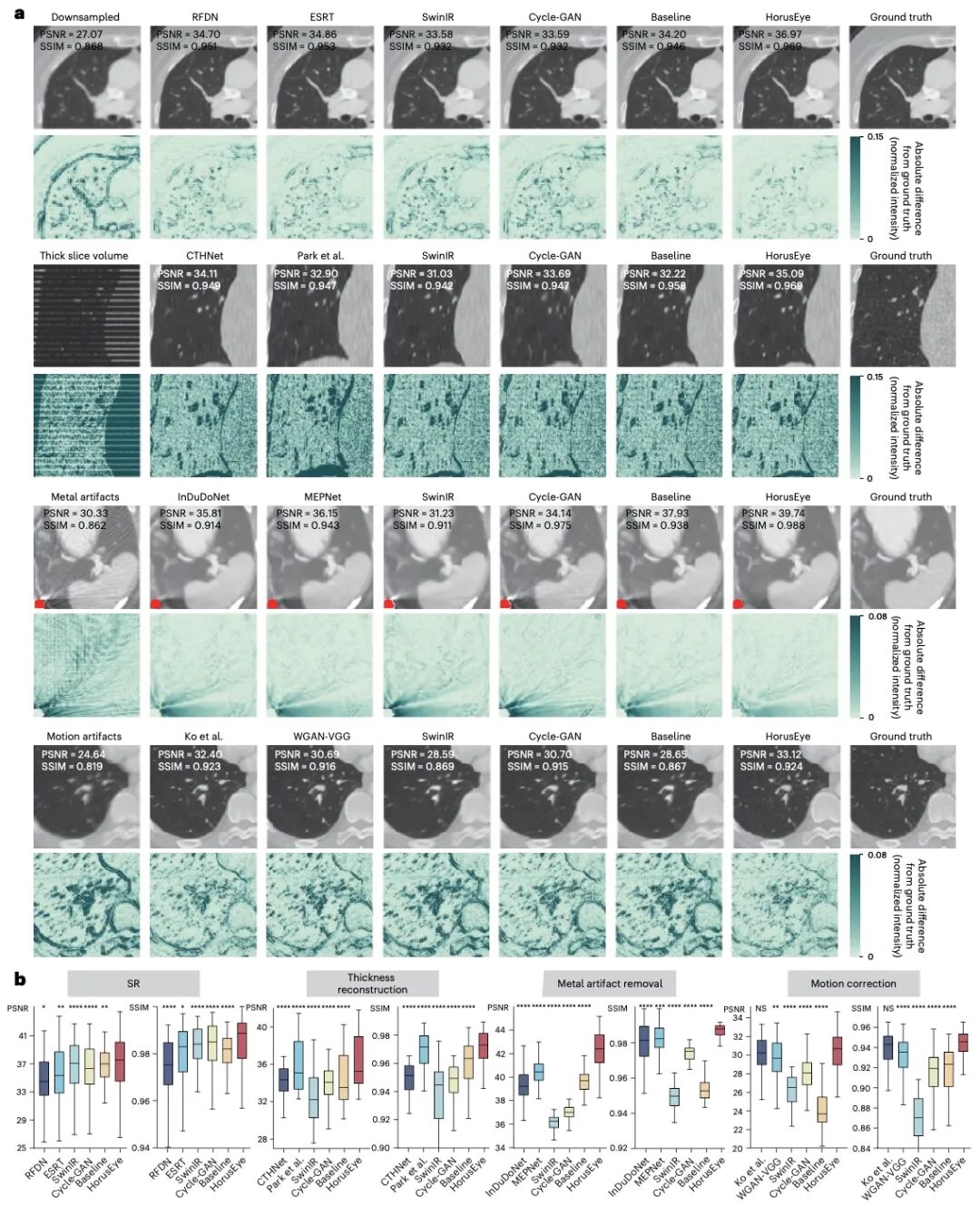 图 4:HorusEye 在其他修复任务上的应用。a,超分辨率、层厚重建、金属伪影去除和运动校正的可视化结果及与真实值的差异图;b,PSNR 和 SSIM 定量分析