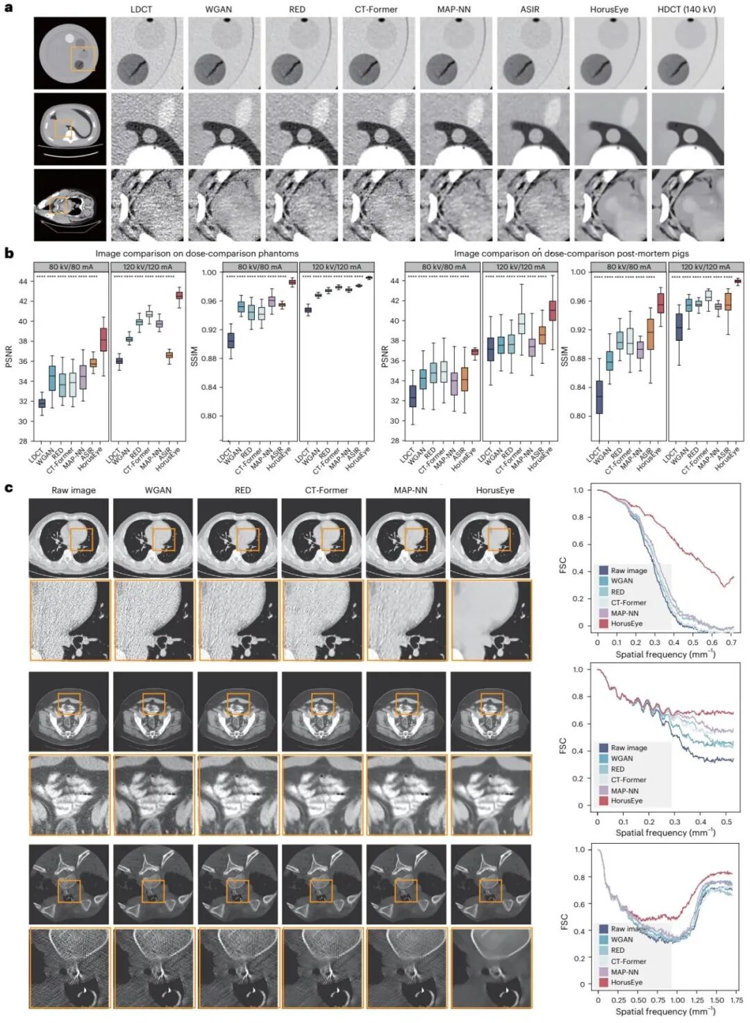 图 2:HorusEye 在医学 CT 上的应用。a,体模和离体猪的剂量对比去噪可视化结果;b,PSNR 和 SSIM 定量对比;c,真实临床 CT 去噪结果及 FSC 曲线对比
