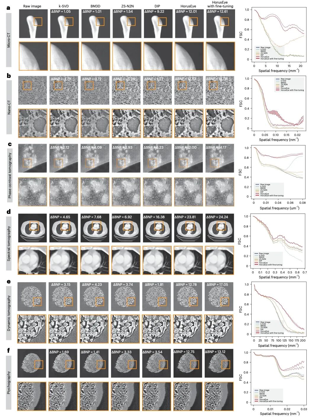 图 3:HorusEye 在多种 X 射线断层成像模态上的应用。a-f,微 CT(鸡骨)、纳米 CT(电极)、相衬断层成像(肾脏)、能谱断层成像(人体胸部)、动态断层成像(合成岩浆)和叠层衍射成像(纳米多孔玻璃)的修复结果与现有最优方法对比