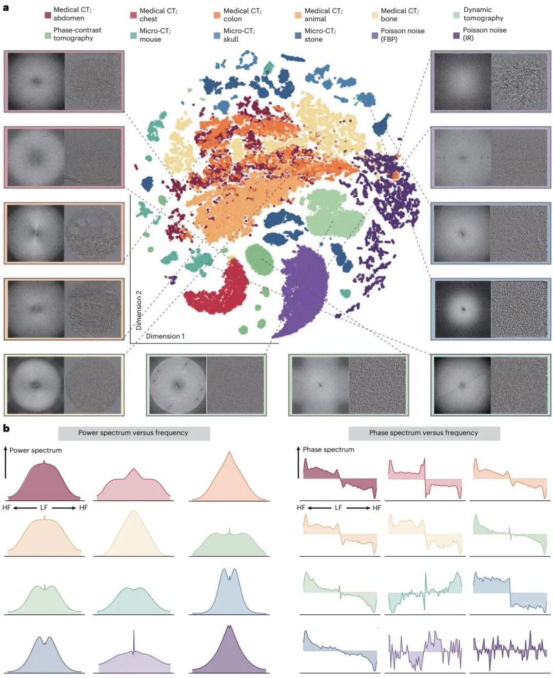图 6:利用 HorusEye 进行 X 射线断层成像退化分析。a,103,725 个噪声样本的 t-SNE 聚类可视化,不同数据集的噪声自然形成清晰簇;b,噪声功率谱和相位谱随频率的分布特征