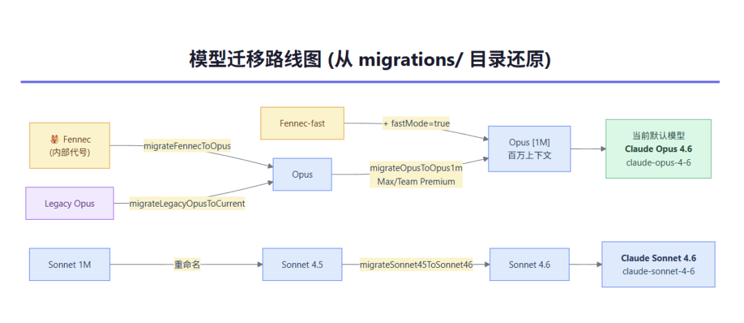 注意这个 fennec——这是 Anthropic 内部的模型代号,此前从未公开。迁移逻辑里还有 fennec-fast-latest → opus[1m] + fastMode=true,说明 Fast Mode 最初就是从 Fennec 模型衍生的能力。还有一个 migrateLegacyOpusToCurrent.ts,暗示 Opus 经历了不止一次大版本迭代。