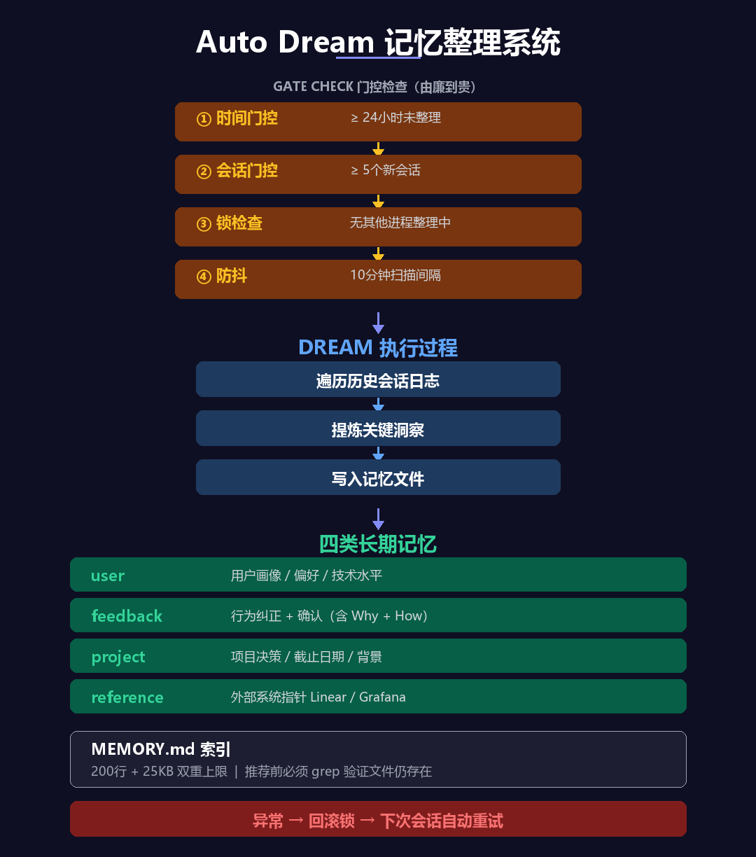 具体逻辑是:距上次整理 ≥ 24 小时 且 积累了 ≥ 5 个会话 → 触发 启动一个后台子代理执行 /dream 技能 遍历历史会话日志,将洞察蒸馏成记忆文件 有锁机制防止并发,有回滚机制防止失败污染