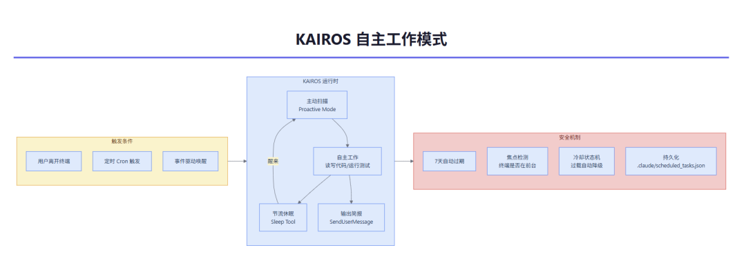Proactive Mode:AI 主动观察代码库、发现问题、提交建议 Sleep Tool:AI 可以让自己“睡一会儿”来控制节奏,不会疯狂空转 Brief Tool(SendUserMessage):一套独立的输出通道,AI 干完活给你发条“简报” Cron 定时任务:支持设置定时任务,AI 按计划自动执行,还能持久化到.claude/scheduled_tasks.json