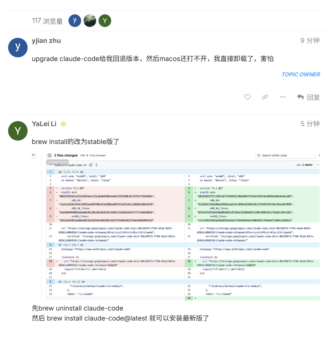 就在源码被扒的同时,有人发现 brew upgrade claude-code 竟然给自己回退了版本,macOS 上还打不开了,吓得直接卸载。