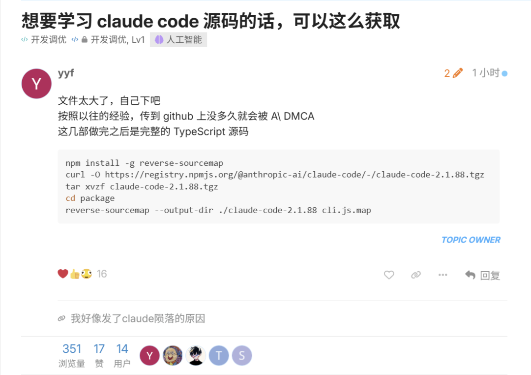 严格说,sourcemap 是 Anthropic 自己留在 npm 公开包里的。用 reverse-sourcemap 工具一键还原,不需要任何破解。