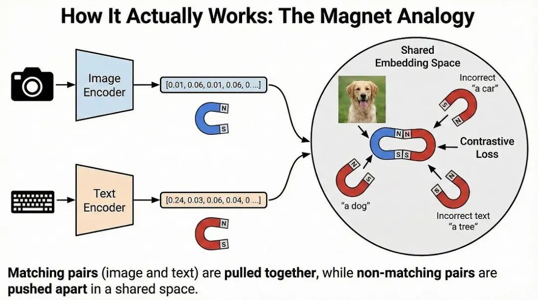 训练目标简单而强大:将这些向量拉近。就像磁铁的南北极相互吸引一样,模型调整其内部参数,使得图像的数值表示与文本的数值表示变得更加相似。