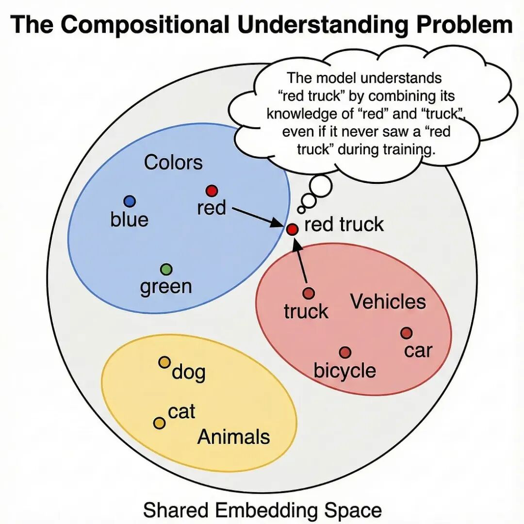 由于模型在一个共享空间中学习了视觉特征和文本特征,它能够以新颖的方式组合概念。如果它学会了“红色”的样子(来自“红苹果”、“红色汽车”、“红色夕阳”),并且知道了“卡车”的样子(来自“送货车”、“皮卡”、“消防车”),那么即使它在训练过程中从未见过“红色卡车”这个确切的短语,它也能推断出“红色卡车”应该是什么样子。