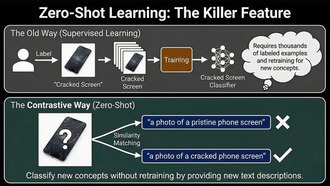 向VLM输入一张图片。给它两个文本提示:“一张完好无损的手机屏幕照片”和“一张屏幕破裂的手机照片”。模型会检查其内部的嵌入空间。这张图像的向量更接近“完好无损”的文本向量,还是更接近“破裂”的文本向量?判断完成。