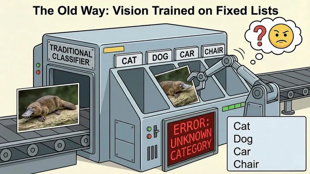 我们正在从脆弱的、任务特定的AI,转向流畅的、与任务无关的、可以用语言引导的AI。你无需为了识别一个新的对象类别而重新训练模型,只需描述它即可。模型会在它已经学习到的嵌入空间中找到它
