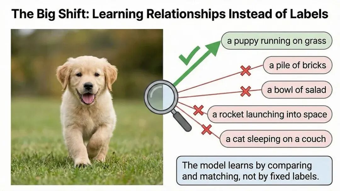 这之所以至关重要,是因为它模仿了人类(作为儿童时)实际学习语言和视觉概念的方式。你并不是在记忆一个查询表。你是在看着狗的时候,反复听到“那是一只狗”,在不同情境下(大狗、小狗、奔跑的狗、睡觉的狗)听到数十次,然后你的大脑通过与“不是狗”的事物进行对比,学习到了模式,即“狗”的本质。