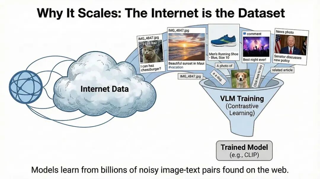 这使得公司能够利用从网络上抓取的海量、杂乱的数集据进行训练。这些数据集足以让传统的监督模型彻底崩溃。CLIP就是在互联网上的4亿个图像-文本对上训练出来的。你永远无法手工标注那么多图像。但你可以利用网络上现有的结构。