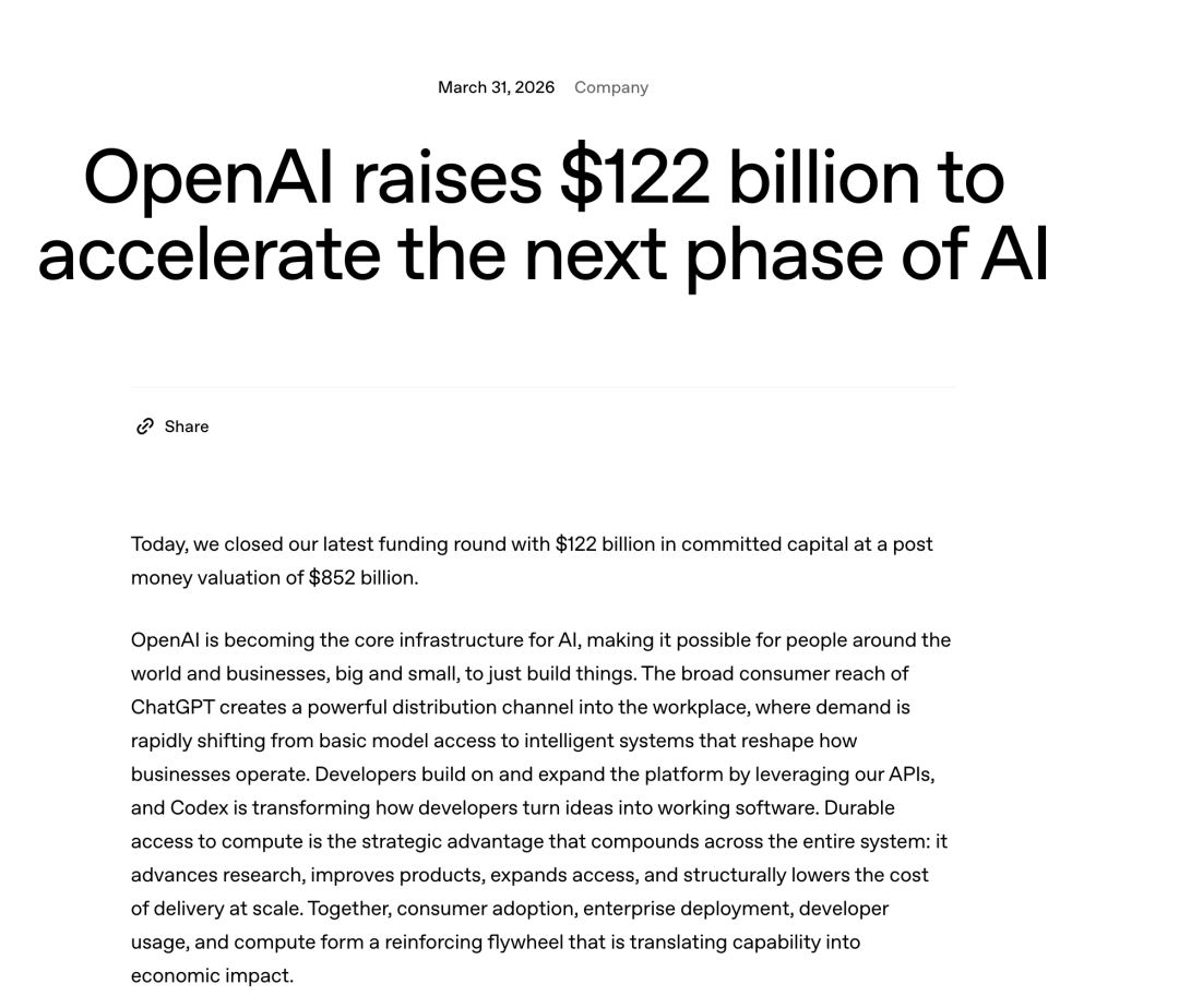2026年3月31日,OpenAI宣布以8520亿美元的投后估值关闭其最新一轮融资,总承诺资本达到1220亿美元。这是这是硅谷史上最大规模的融资之一。同一天,OpenAI首次通过银行渠道向个人投资者出售了约30亿美元的股份,并宣布其股票将被纳入Cathie Wood旗下ARK Invest管理的多只ETF。