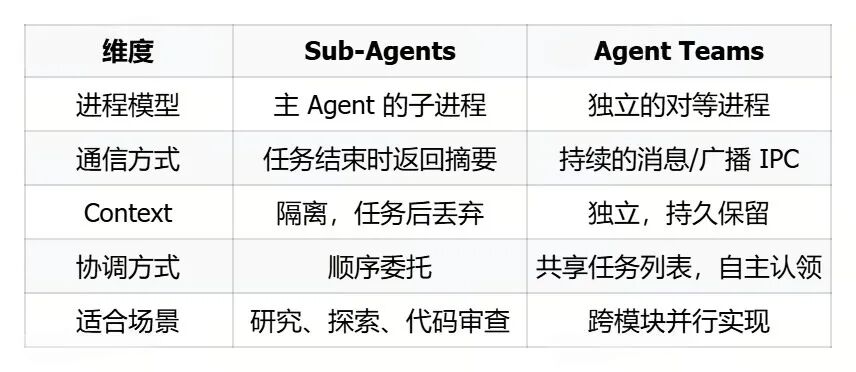 这不再是主 Agent 派遣子 Agent 的主从关系,而是完全独立的 Claude Code 实例通过共享文件系统协调任务。两者区别: