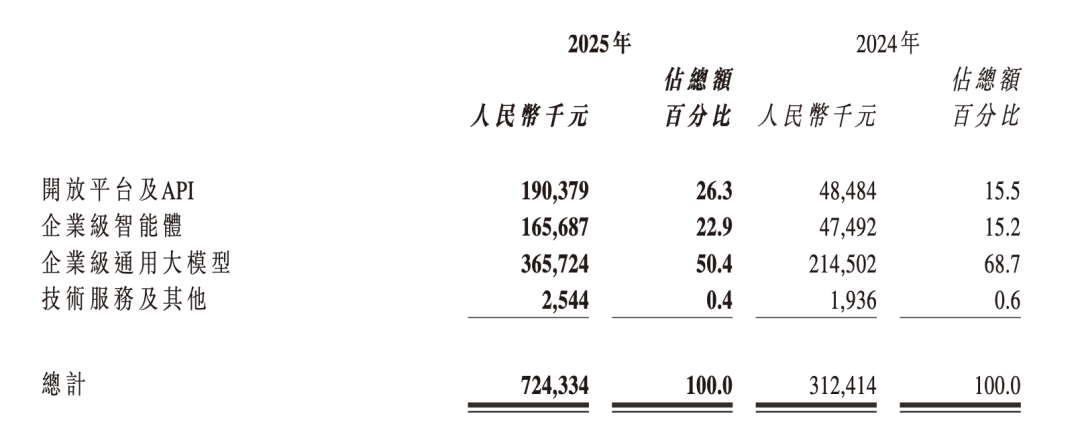 首先,收入规模与结构发生根本性转换。财报显示,智谱在2025年全年实现总收入7.24亿人民币,同比增长131.9%,稳居国内大模型公司收入规模榜首。