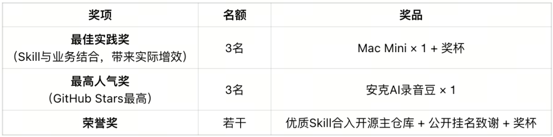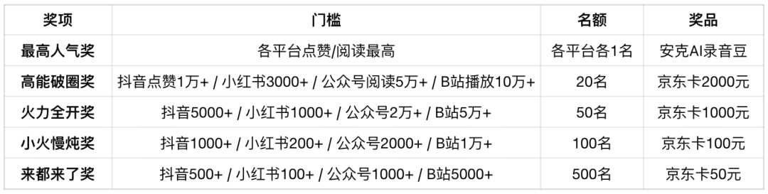 不管你是写代码的开发者,还是做内容的创作者,都能参与。奖品包括Mac Mini、京东卡、安克AI录音豆等等,门槛不高,值得一试!