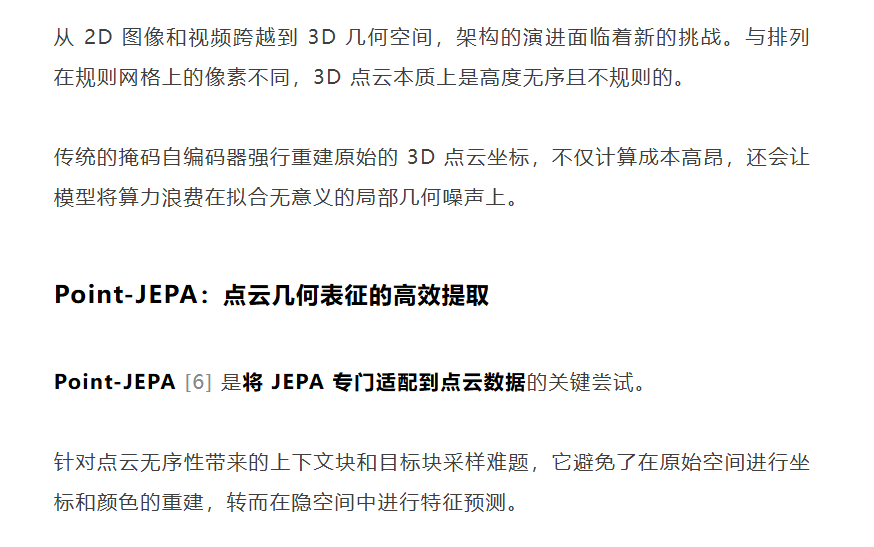 3D-JEPA [7] 进一步拓宽了架构在三维空间的适用范围,将应用场景从单一的点云数据扩展到了更广泛的三维特征学习。它标志着该架构已经成熟,可以作为处理完整 3D 语义的基础框架。