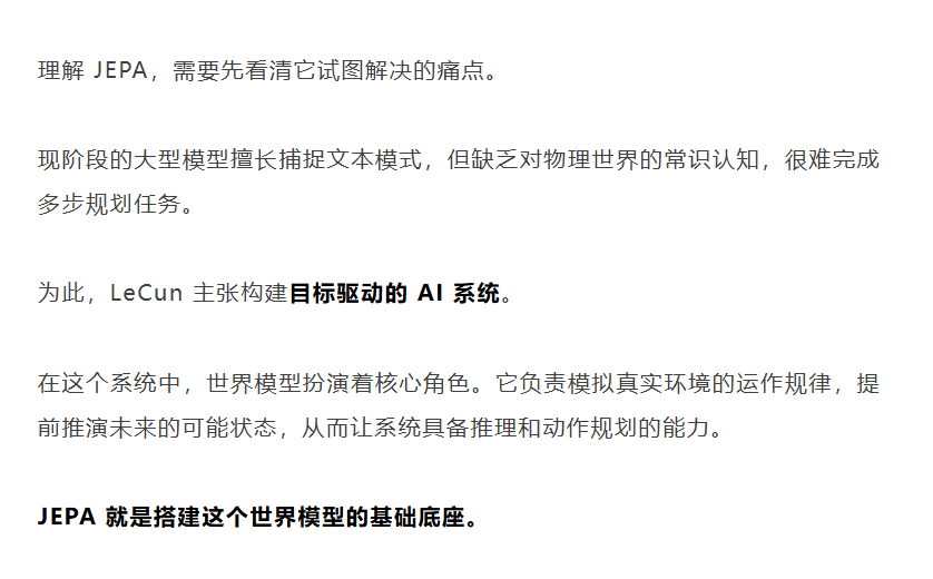 在这个节点,JEPA 正式演变为一个能够执行理解、预测与规划的显式世界模型。