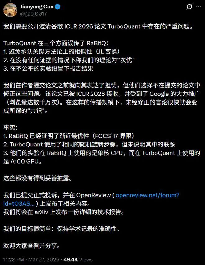 谷歌一篇备受赞誉的论文《TurboQuant》,被指系统性忽视、贬低并变相“挪用”华人学者高健扬博士团队早先发表的开源工作RaBitQ。核心争议有三点:方法雷同但未正视——双方均以“随机旋转(JL变换)+向量量化”为关键技术,而TurboQuant在正文中刻意将RaBitQ归类为无关的“网格型PQ”,仅在附录轻描淡写提及。