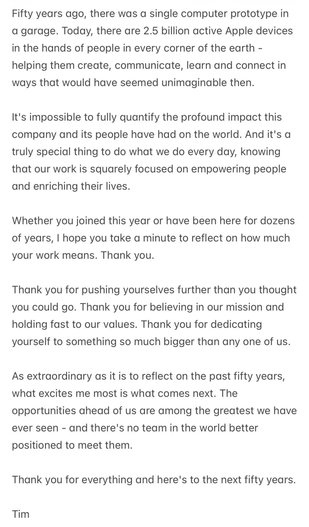库克致苹果员工五十周年信:称「最好的日子还在前方」