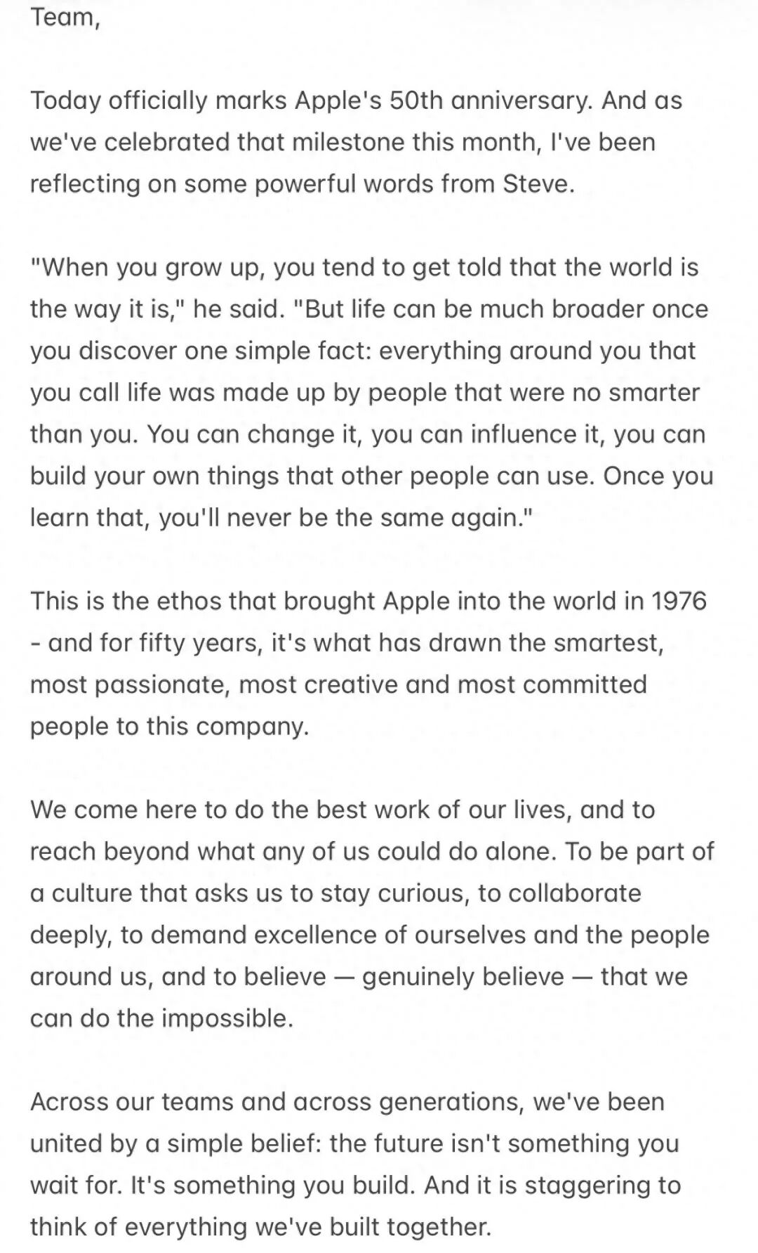 比起回顾过去,库克更看重的是未来。他在信中写道,「尽管回顾过去 50 年令人无比振奋,但最让我兴奋的是接下来将要发生的一切」。在库克的表述中,苹果面前的机会「是我们有史以来所见过的最伟大机遇之一」,而公司也拥有「全世界最适合把握这些机遇的团队」。