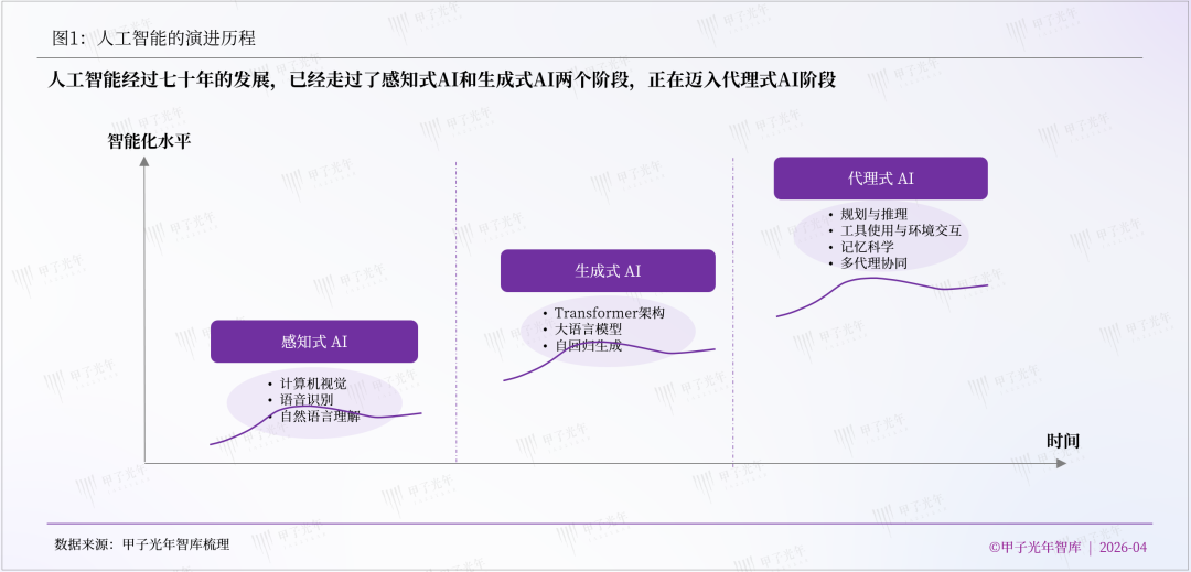人工智能的发展路径,为这一转变提供了清晰的技术逻辑。从早期以视觉识别和语音识别为代表的感知式AI,到以大语言模型为核心的生成式AI,再到当前以任务执行为导向的代理式AI,技术演进的本质是机器能力从“感知世界”走向“改造世界”。
