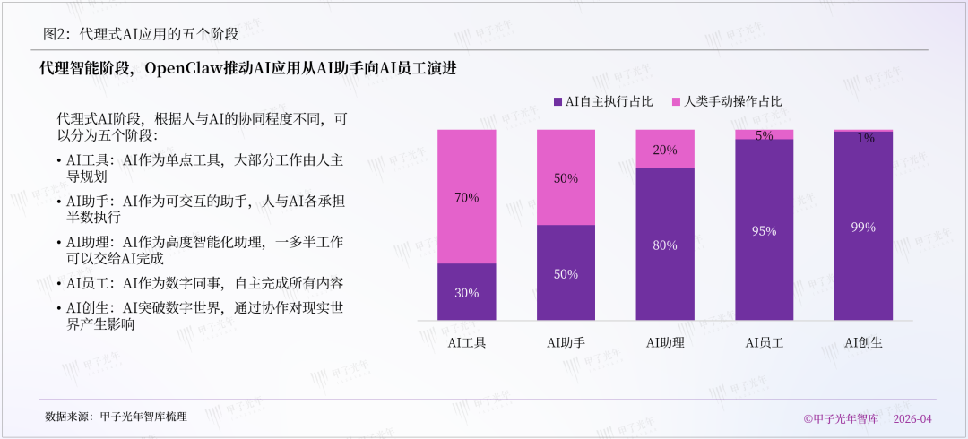 根据人与AI的协同程度不同,甲子光年智库将代理式AI的应用演进分为五个阶段: