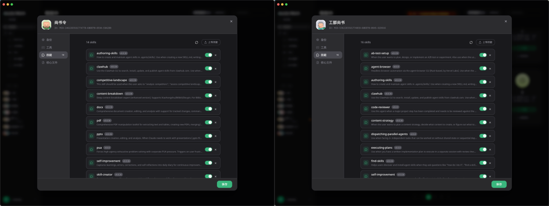 比如尚书令,就装了文档处理四件套,加上他是那个督促大家干活的人,所以也给他装了pua的skill。
