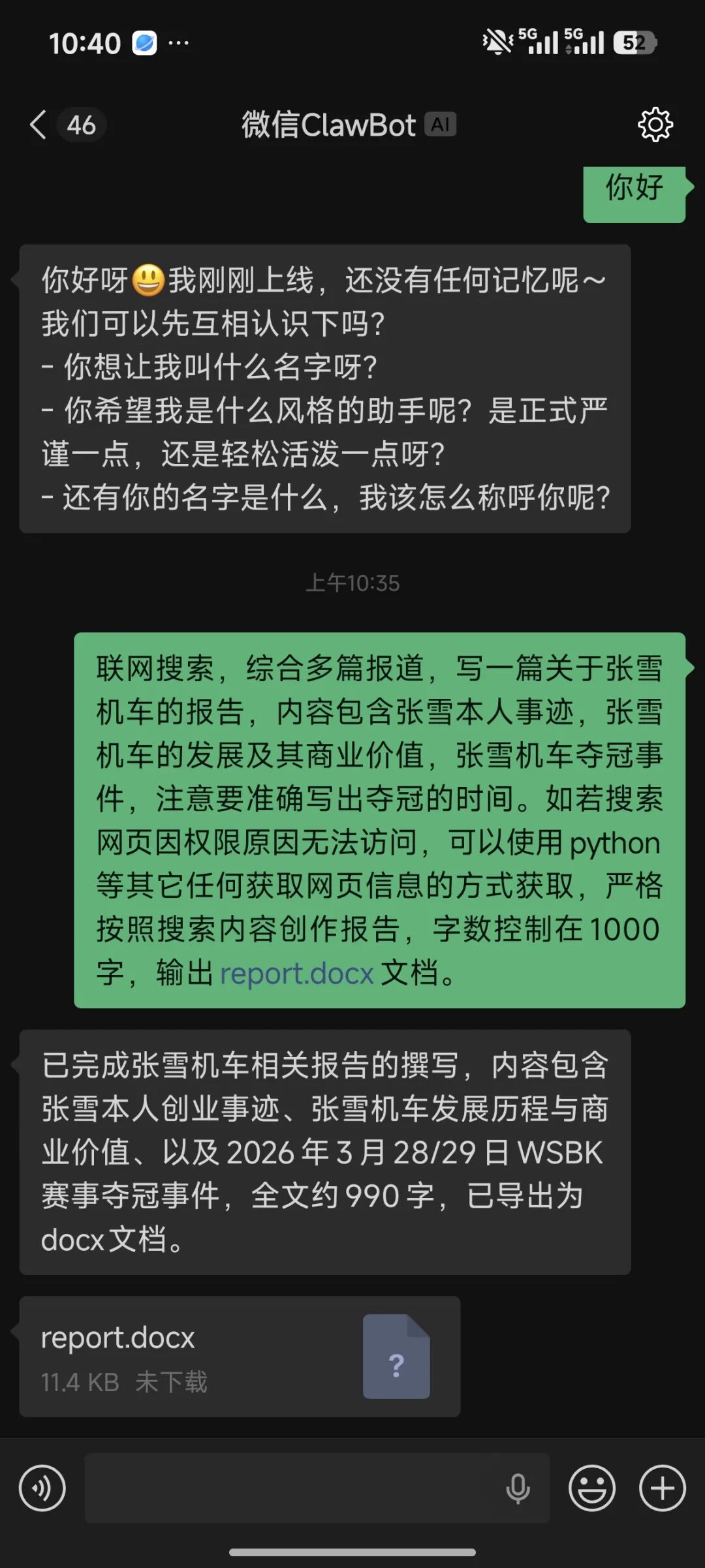 第一步:在手机微信端,打开微信ClawBot聊天交互界面发送消息:联网搜索,综合多篇报道,写一篇关于张雪机车的报告,内容包含张雪本人事迹,张雪机车的发展及其商业价值,张雪机车夺冠事件,注意要准确写出夺冠的时间。如若搜索网页因权限原因无法访问,可以使用python等其它任何获取网页信息的方式获取,严格按照搜索内容创作报告,字数控制在1000字,输出report.docx文档。具体展示如图所示: