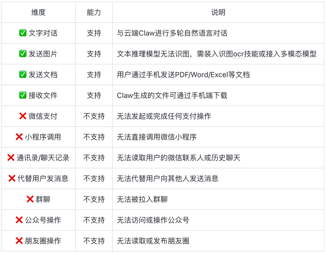 作为统一的 Claw 产品接入入口,ClawBot 的交互能力严格限定于微信私聊场景。其功能定位为“单用户私聊 + 文件/图片收发”的轻量化接入通道,而非具备全功能交互能力的自动化平台。这一能力边界直接定义了 Agent 可执行的操作类型,也成为本次评测基准 SC-WeClaw 的核心设计约束。ClawBot 的具体功能支持情况如下: