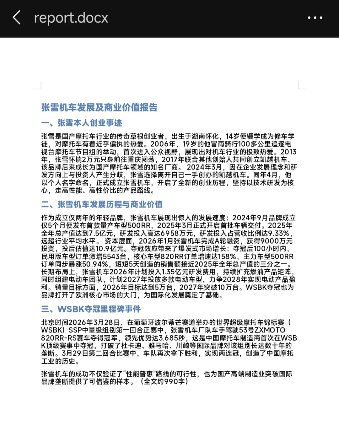 评分说明:报告在字数、日期、段落结构等基础指标上全部达标,且完整覆盖了张雪机车首款车型500RR、2026年3月28日夺冠、3月29日二连冠以及10.9亿估值等所有关键事实,结构清晰、内容准确,因此各项评分均为满分。