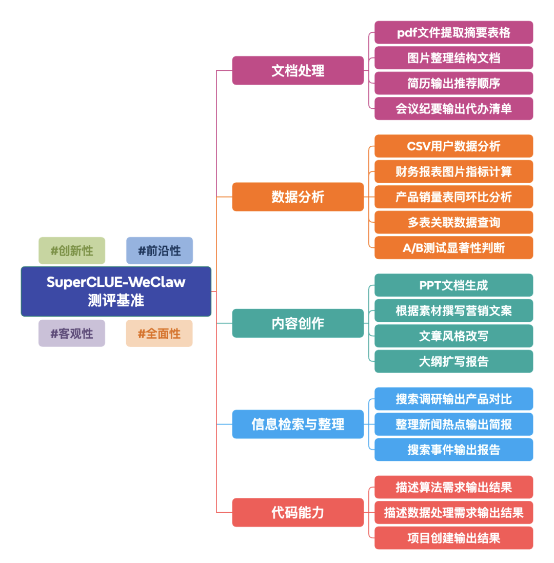 当前,微信已上线 ClawBot 插件功能,为字节跳动 ArkClaw、智谱 AutoClaw、腾讯 QClaw 等主流 Claw 产品提供了统一的接入入口。用户完成配置后,仅需扫描二维码即可在微信对话中与 Claw 进行交互,无需安装任何额外应用,便可完成文件处理、图片分析、文档生成等各类任务。然而,在相同的接入环境与交互通道下,不同 Claw 产品的实际表现如何?各产品在微信 ClawBot 中的 Agent 能力是否存在显著差异?目前尚缺乏一套系统性的评测基准来回答上述问题。为此,我们推出 SC-WeClaw——一套专门面向微信 ClawBot 接入场景的 Claw 产品能力测评体系。SC-WeClaw 延续了SuperCLUE-XClaw 的评价方法,详细参考:国产龙虾Claw产品首测:10款产品真实测评