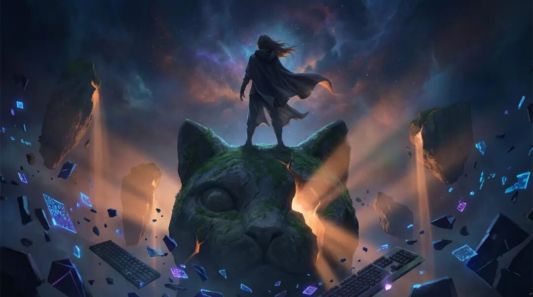 我收到的是一个披着披风的人站在猫头石像上面,周围是碎裂的键盘和屏幕碎片