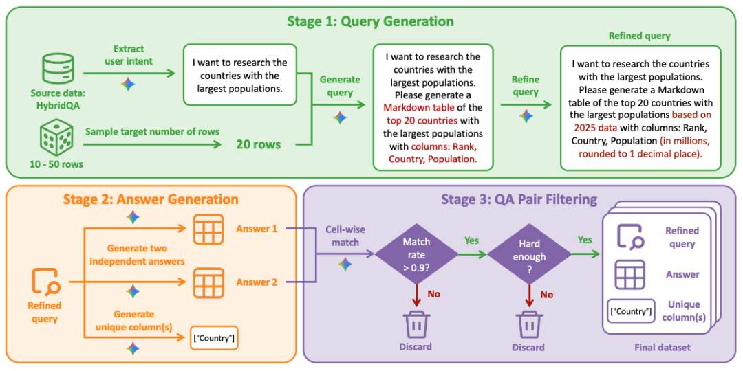 2. 答案生成: 利用 Gemini-3-Pro 独立生成两个答案及唯一标识列;