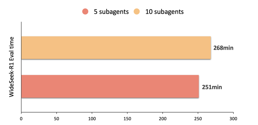 系统性能效果:WideSeek-R1 通过广度拓展有效拓展信息获取的范围,而广度的拓展是通过更多的并行 subagents 完成的。从下图实验数据可见,通过高效的系统实现与并发优化,拓展一倍的 subagents 的数量并没有带来明显的 eval 时间的增加,充分说明系统在 scaling 上的有效性。
