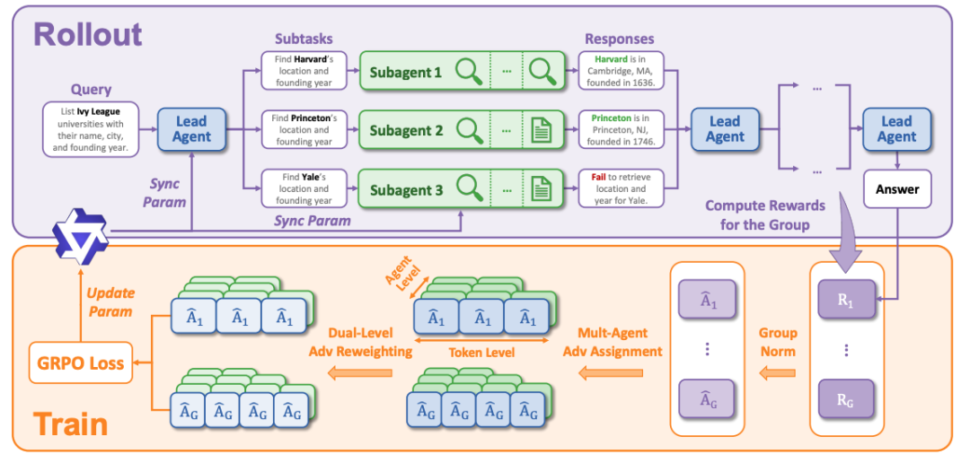 为了训练这个系统,研究团队在 GRPO 算法基础上,针对多智能体、多回合场景进行了两项关键改进: