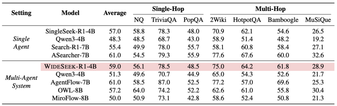 在 NQ、HotpotQA 等 7 个标准问答数据集上,WideSeek-R1-4B 同样表现出色,平均分达到 59.0%,优于部分 7B/8B 的多智能体基线(如 AgentFlow, OWL 等),证明了模型并未因专注于广度搜索而牺牲通用搜索能力。