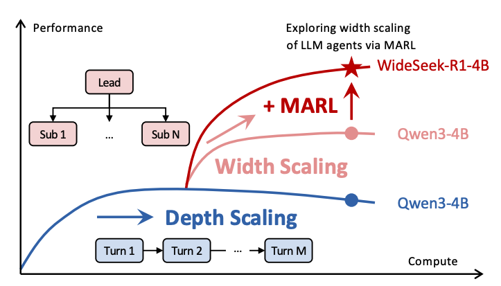 当传统的深度扩展(蓝色曲线)依赖单智能体多轮串行推理而逐渐遭遇性能瓶颈时,广度扩展(粉色曲线)通过增加智能体个数,通过多智能体并行执行开辟了新的增长路径;而 WideSeek-R1(红色星号),通过多智能体强化学习(MARL)进一步实现了调度与执行的协同优化,证明了在广度信息搜索任务中,协同的“宽度”扩展能带来比“深度”更显著的性能飞跃。