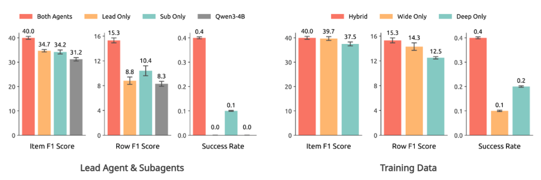 左图:我们发现只有当 Lead-agent 和 Subagents 同时使用 WideSeek-R1-4B 时才能达到最佳性能,这验证了端到端多智能体强化学习训练的重要性。