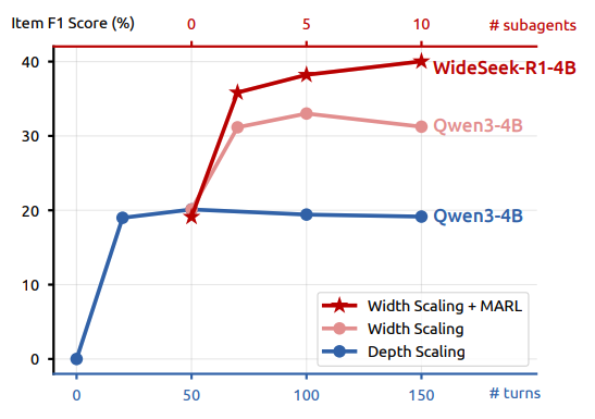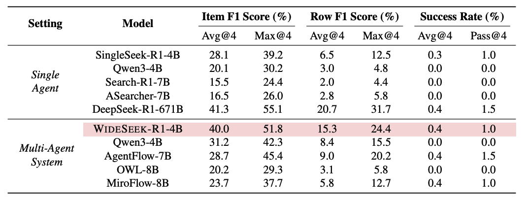 实验结果显示,4B 参数的 WideSeek-R1 在广度搜索任务上的表现达到了40%的 Item F1 指标,不仅看齐 671B 参数的 DeepSeek-R1 单智能体,更大幅超越了同参数规模的基线模型。